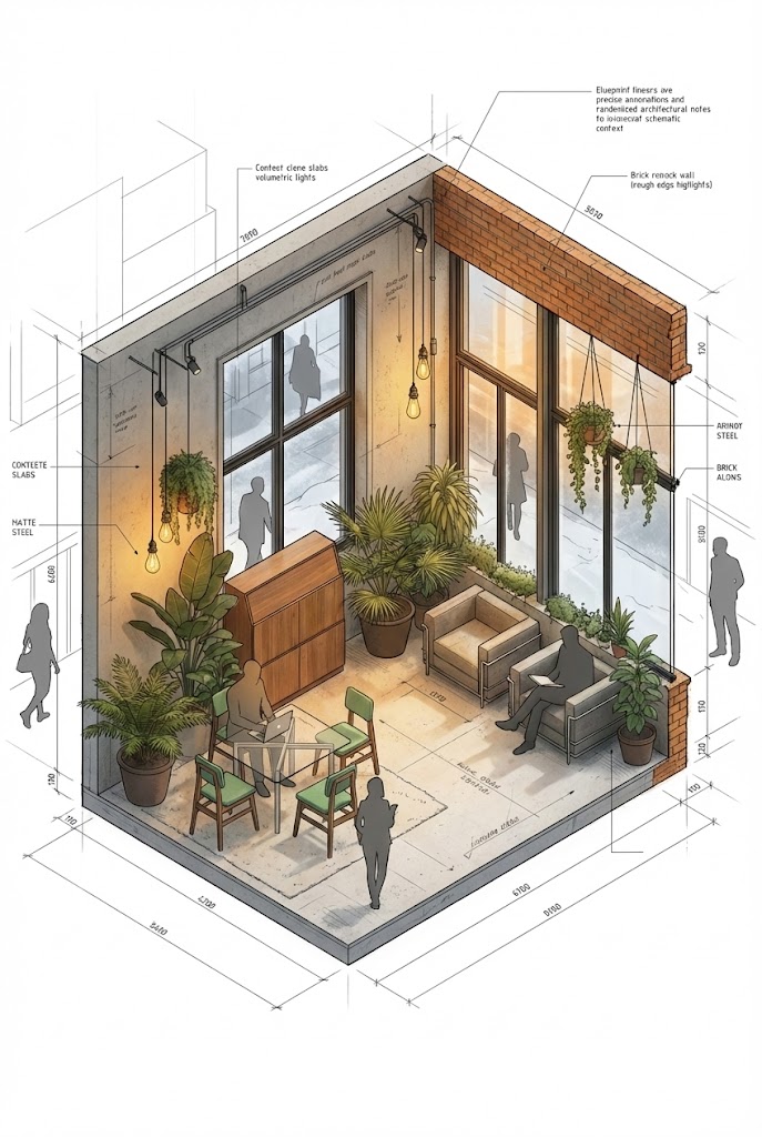 These interior renderings showcase a modern minimalist space designed with a strong focus on natural light, material realism, and calm atmosphere. Warm wooden floors, soft neutral tones, and carefully placed indoor plants create a balanced and inviting environment. Natural daylight enters through large windows, enhancing the realism of textures and emphasizing the relationship between interior space and greenery. Soft indirect ceiling lighting adds depth and warmth, while clean furniture lines reinforce a contemporary architectural language. The overall composition conveys comfort, functionality, and visual harmony—ideal for residential, co-working, or hospitality design presentations. These renderings are suitable for client presentations, real estate marketing, architectural portfolios, and design competitions.