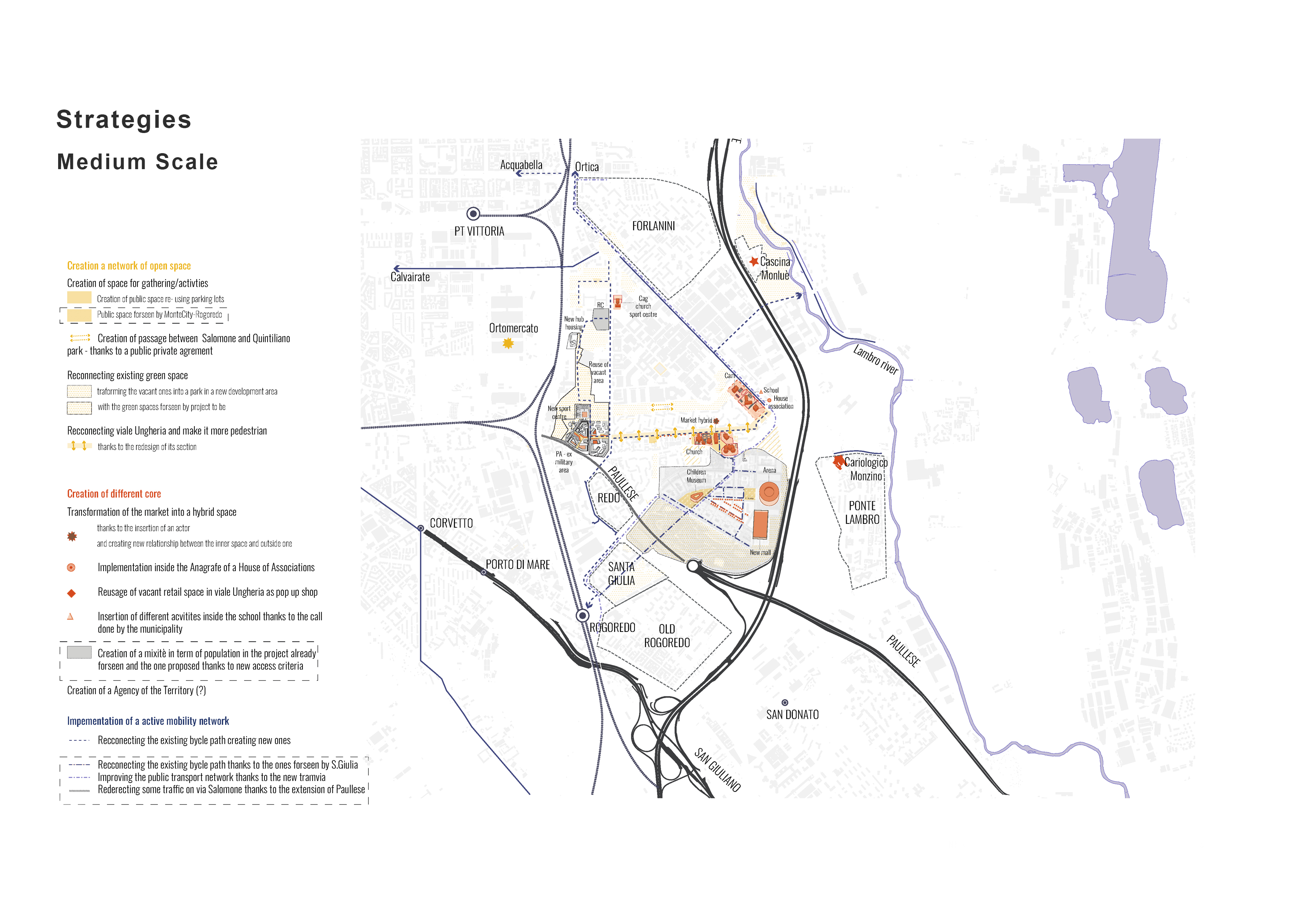 The work examines housing, mobility, retail, services, and public spaces to uncover both resources and shortcomings, while also exploring governance and participatory approaches that could foster more resilient development. Building on these insights, the project proposes strategies to redefine Morsenchio’s identity within the 15mc framework—enhancing accessibility, strengthening community connections, and promoting sustainability. The resulting proposal provides not only a roadmap for Morsenchio’s transformation but also broader reflections on how the 15-Minute City can be applied to similar neighborhoods, supporting the creation of self-sufficient, inclusive, and livable urban environments.